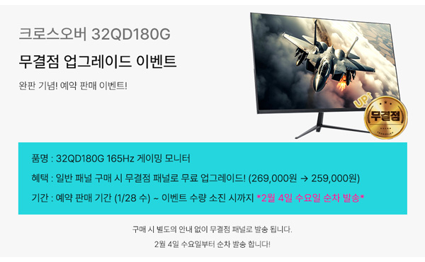 이번 이벤트는 32QD180G의 완판을 기념하기 위해 준비됐다. 다양한 마켓들을 대상으로 1 28(수 ~ 이벤트 제품 소진시까지 진행되는 이번 행사에서 크로스오버 32QD180G IPS WQHD 게이밍 AI 일반 버전을 구입하면 무결점 모델로 출고된다.
