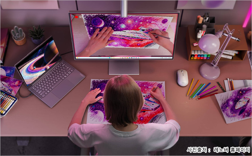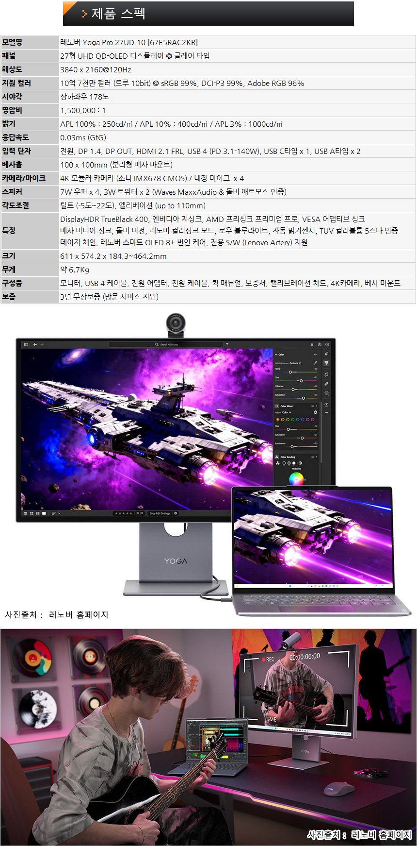 레노버 Yoga Pro 27UD-10 는 크리에이터와 스트리머, 영상 및 디자인 전문가를 위한 모니터로 4K 해상도의 퀀텀닷 OLED 패널을 사용해 색손실 없이 선명하게 컬러를 표현하며 공장 캘리브레이션을 거쳐 생산해 최고 수준의 색상 균일성과 정확도를 보장한다. 도입부에서 언급한 것과 같이 사람이 인식하는 색 표현력을 측정하는 TUV 인증에서 5스타를 획득했으며 돌비 비전등의 기술도 지원해 일반 모니터에서는 경험할 수 없는 선명하고 정확한 컬러를 보여준다.
