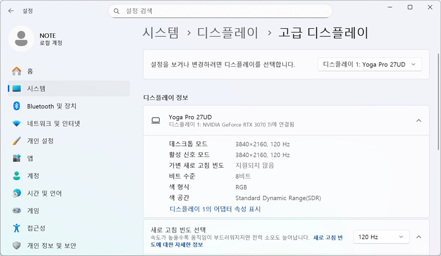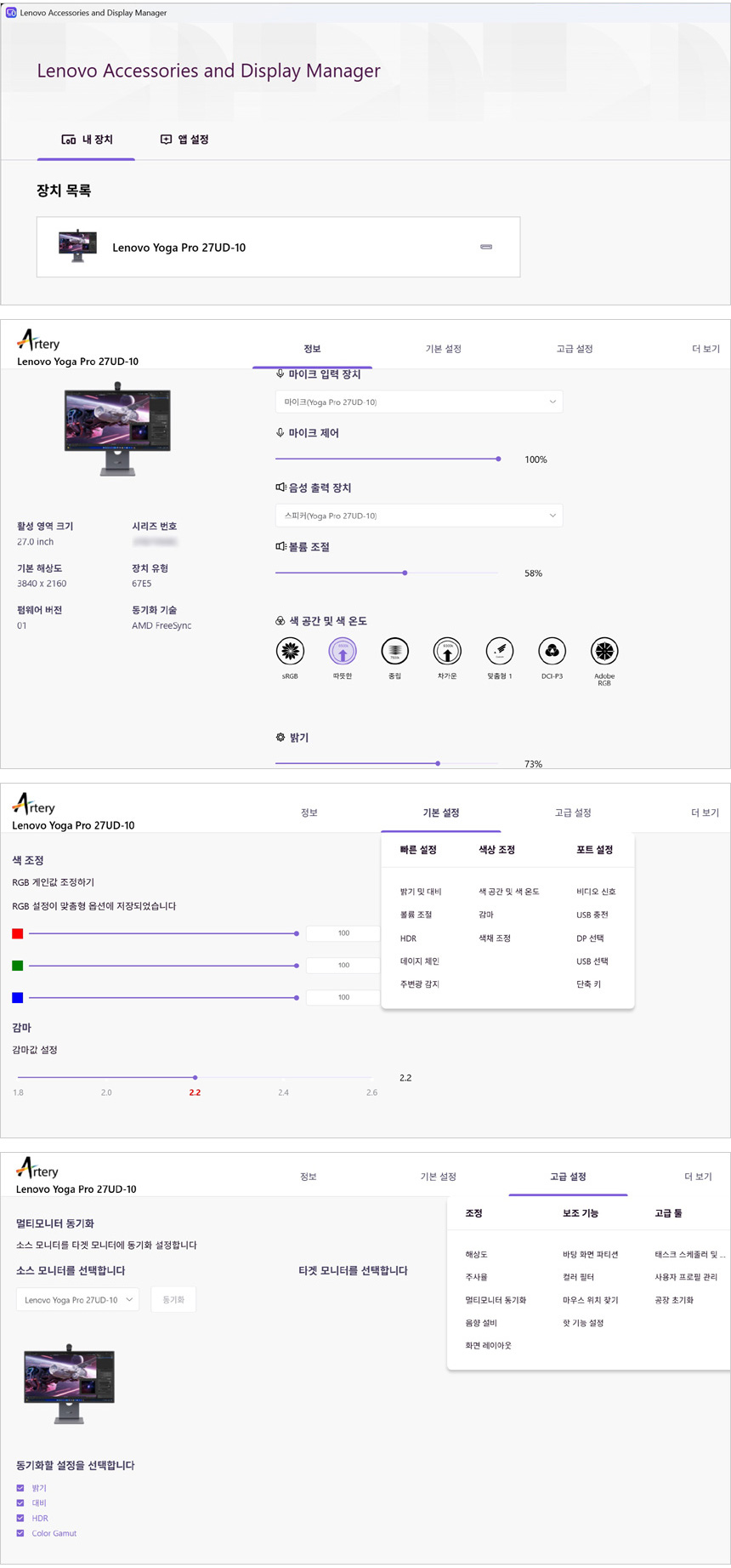 MS 스토어에서 디스플레이 매니져 S/W를 설치해 사용할 수 있다. (기존에 S/W가 설치되어 있다면 꼭 업데이트를 진행하기 바란다. 최신 업데이트 상태에서만 요가 프로 27UD-10 이 인식되기 때문이다.) 상단의 사진은 레노버 디스플레이 매니저를 실행한 모습으로 시스템 정보가 표시되며 밝기와 명암비, 입력소스, 색공간 등을 빠르게 조정할 수 있다. 기본기능과 고급기능으로 구분되며 OSD에서 지원하는 기능 뿐만 아니라 윈도우 디스플레이 설정도 제공해 편하게 모니터를 사용자에 맞게 셋팅할 수 있다.