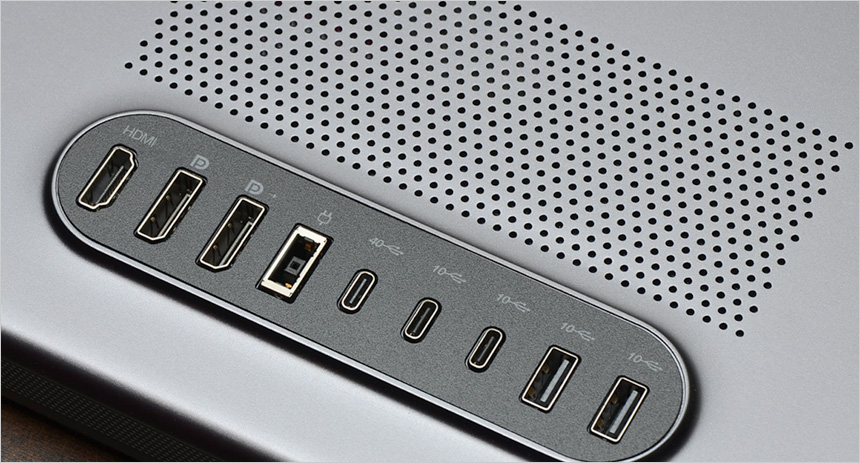 안정성을 높이기 위해 통풍구가 설치되어 있고 하단에는 HDMI 2.1과 DP 1.4, C타입의 USB4 연결단자를 지원해 다양한 디바이스와 연결해 활용할 수 있다. 뿐만 아니라 총 4개의 USB 단자가 제공되어 주변기기를 편하게 연결할 수 있다.