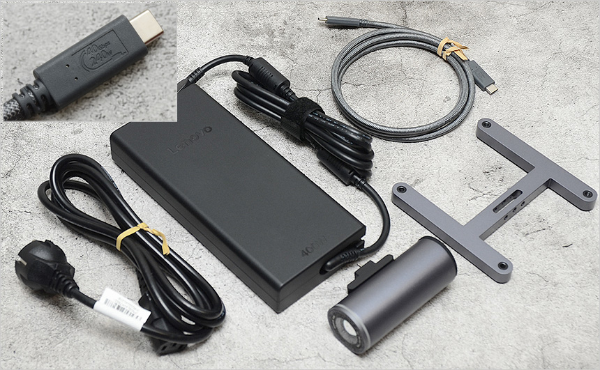 액세서리의 모습으로 400w 전원 어댑터를 비롯해 (140W PD충전 지원 모델이기 때문에 대용량 어댑터를 제공하는 것이다.) 전원 케이블과 40Gbps & 240W 지원 C타입 케이블이 제공되며 베사마운트와 4K 카메라, 캘리브레이션 차트, 퀵 매뉴얼, 보증서 등이 포함되어 있다.