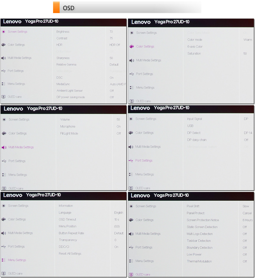 OSD 의 모습으로 화면과 컬러 설정을 비롯해 사운드, 포트 등 다양한 설정이 제공되는 것을 확인할 수 있다. 특히 디스플레이 부분에서 강조한 것과 같이 OLED 케어 기술이 적용되어 OLED 패널의 최대문제인 번인등으로 인한 걱정없이 모니터를 사용할 수 있다.