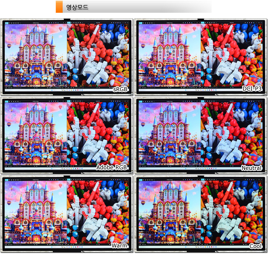 다양한 색공간 & 색온도 지원으로 컨텐츠에 최적화된 영상을 구현할 수 있다. 상단의 사진은 지원모드를 비교한 모습으로 영상의 밝기와 색 등이 확연하게 달라지는 것을 확인할 수 있었다. 일일이 밝기나 명암비, 색온도를 조절해야 하는 모니터들과 달리 전용 S/W 통해 게임 실행중에도 손쉽게 영상을 조정할 수 있다.