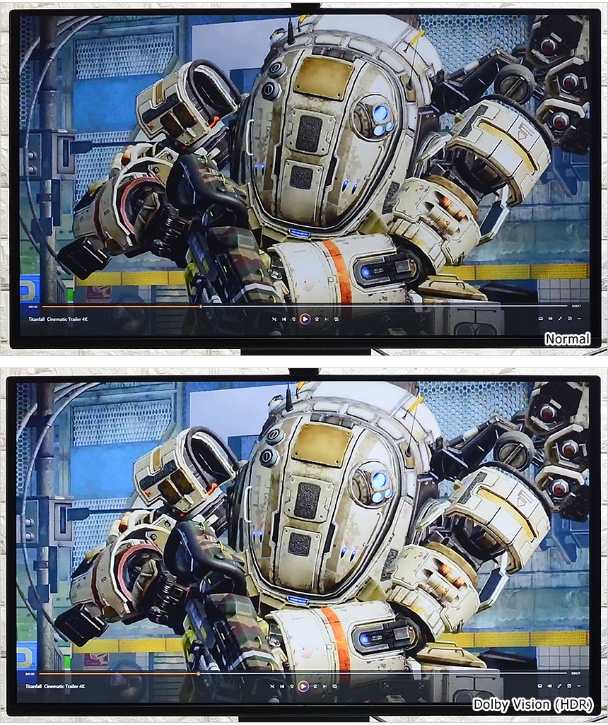 HDR 설정이 가능하고 돌비 비전 기술이 적용되어 사실감 넘치는 영상을 즐길 수 있다. 상단의 사진은 노멀 모드와 HDR 활성화 모드 (돌비 비전)를 비교한 모습으로 분명한 차이를 경험할 수 있었다. 특히 HDR 적용시 뿌연 느낌을 주는 일부 모니터와 달리 선명도를 유지하는 것이 인상적이었다.