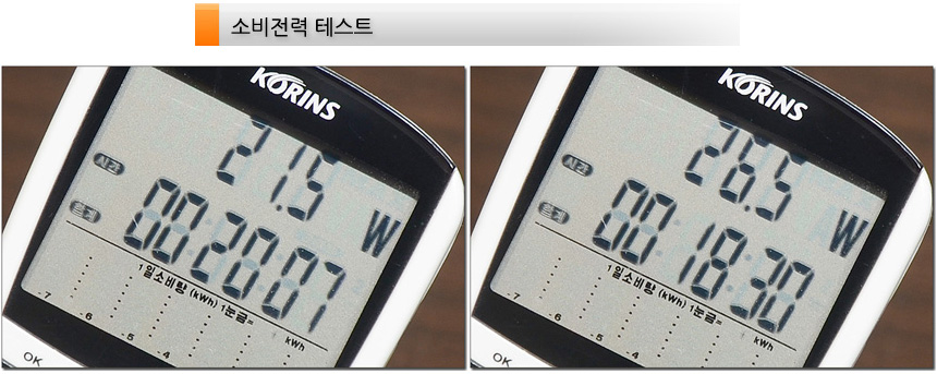 소비전력 테스트를 진행하고 있는 모습으로 (프리미엄 컬러 기준) 100% 밝기 에서는 23~29W 의 소비전력으로 작동했으며 50% 밝기에서는 21~25W 까지 소비전력이 낮아지는 것을 확인할 수 있었다. (경쟁사 모델대비 소비전력이 대단히 낮은 것이 인상적이다. 전기세 걱정없이 사용할 수 있을 것이다.)