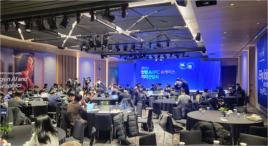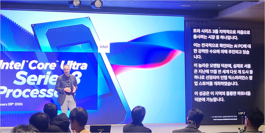인텔은 삼성동 웨스틴 서울 파르나스에서 ‘2026 인텔 AI PC 쇼케이스 기자간담회’를 개최하고, 인텔의 최신 AI PC 전략과 인텔 18A 공정 기반의 인텔 코어 Ultra 시리즈 3(코드명: 팬서레이크)를 포함한 인텔 코어 Ultra 시리즈 프로세서를 탑재한 최신 AI PC 제품들을 한자리에서 소개했다. 특히 통역사의 동시통역으로 행사를 진행하지 않고 AI 기술을 활용한 실시간 번역을 통해 행사가 진행되었다.