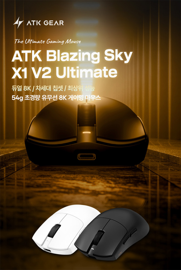 ATK X1 V2 ULTIMATE는 차세대 듀얼 8K 기술과 초경량 설계를 기반으로 완성된 플래그십 게이밍 마우스로 화이트와 블랙 두 가지 컬러로 출시되어 사용자의 취향에 맞게 선택할 수 있다. 유선·무선·블루투스 연결을 모두 지원해 다양한 사용 환경에 유연하게 대응하며 54g 초경량 구조를 통해 장시간 사용에도 손목 부담을 최소화했다.
