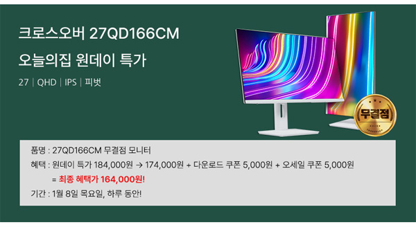 1월 8일 목요일 단 하룻동안 오늘의 집 단독 원데이특가로 진행되는 이번 행사에서 27QD166CM 모니터 무결점 모델을 구입하면 184,000원에서 1만원 할인된 174,000원에 판매된다. 여기에 다운로드 쿠폰 5,000원과 오세일 쿠폰 5,000원을 더하면 최종혜택가 164,000원이라는 파격적인 가격에 제품 구입이 가능하다.