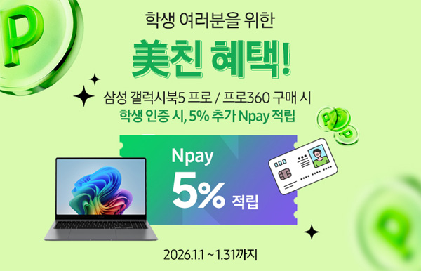 유니씨앤씨는 네이버 스마트스토어에서 삼성 스튜던트 페이백 이벤트를 진행한다. 갤럭시북5 프로 시리즈를 구매하는 학생 고객 대상으로 카드사 간편결제 시 7% 할인과 네이버페이 5% 추가 적립 혜택을 제공하는 이번 프로모션은 2026년 1월 31일까지 진행된다.