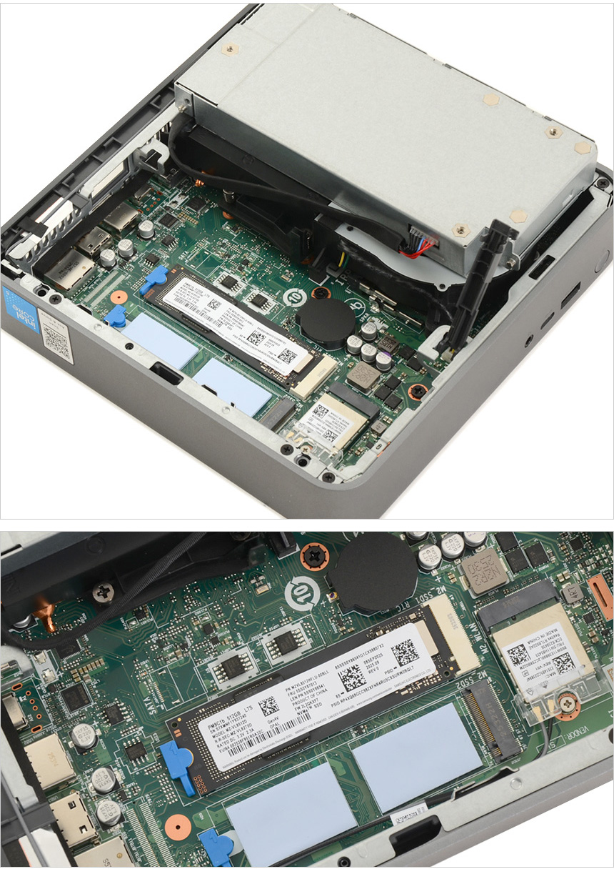 제품 내부의 모습으로 디자인 부분에서 강조한 것과 같이 150W 파워 서플라이가 장착된 것을 확인할 수 있다. (80 PLUS 플래티넘 인증 모델이 탑재되어 있다.) 또한 무선랜 안테나와 히트싱크, 팬이 장착된 것도 확인할 수 있다.