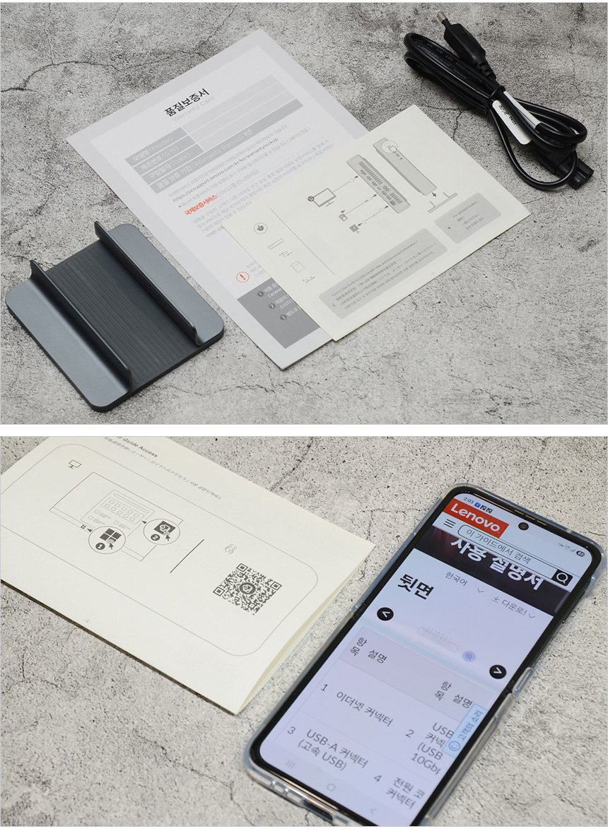 기본 제공되는 액세서리의 모습으로 본체를 비롯해 스탠드와 전원 케이블, 보증서, 퀵 매뉴얼이 포함된 것을 확인할 수 있다. (퀵 매뉴얼에 있는 QR코드를 스마트폰으로 스캔하면 사용설명서를 바로 볼 수 있다.)