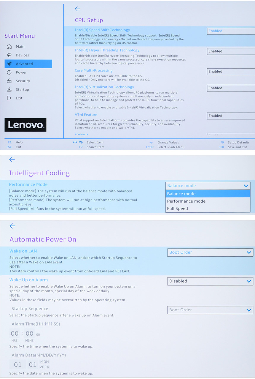바이오스의 모습으로 직관적인 인터페이스를 제공해 손쉽게 기능을 설정할 수 있었다. (지원 매뉴는 일반 PC와 대동소이 하다.) 파워 모드에서 퍼포먼스 설정이 가능하고 자동으로 PC를 켤수 있는 기능이 제공되는 점은 눈에 띈다. @ 저소음에 특화된 모델로 밸런스 모드가 디펄트로 설정되어 있다. 장시간 높은 성능을 필요로 하는 S/W를 사용한다면 팬소음이 좀 커지더라도 퍼포먼스 모드로 변경하기 바란다.