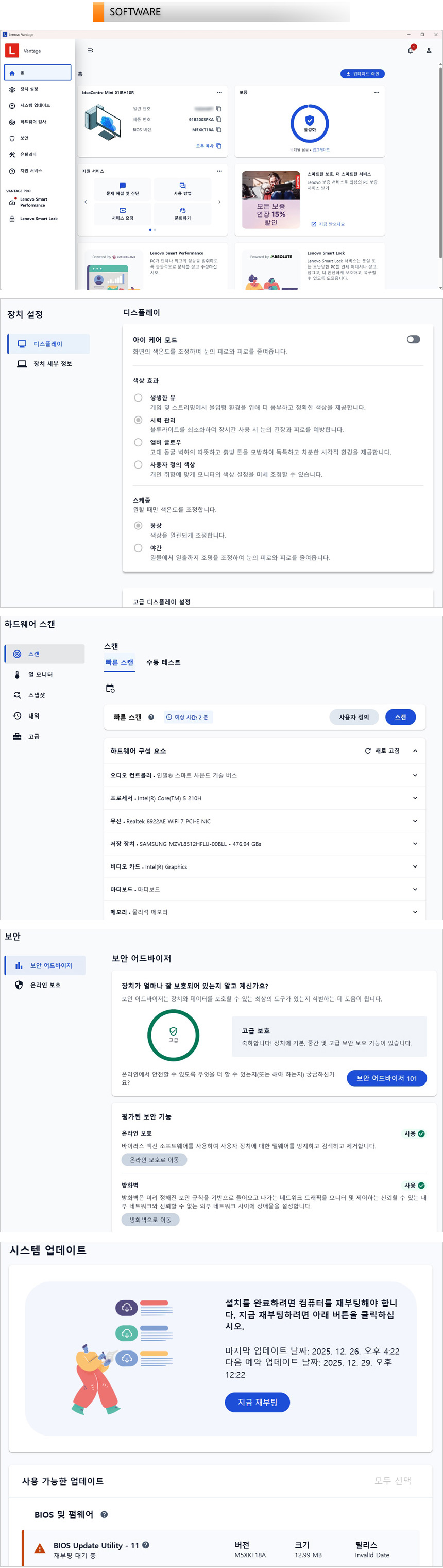 전용 S/W 레노버 Vantage 프로그램이 기본 설치되어 있다. 시스템 업데이트를 지원해 최상의 컨디션을 유지할 수 있으며 보안 설정도 지원한다. 또한 장시간 학습이나 업무를 보는 유저들의 눈건강을 지키기 위해 아이케어 모드를 제공한다.