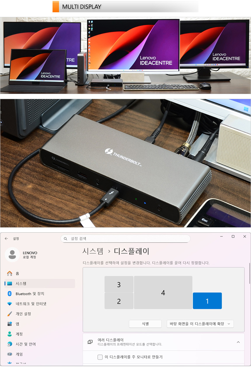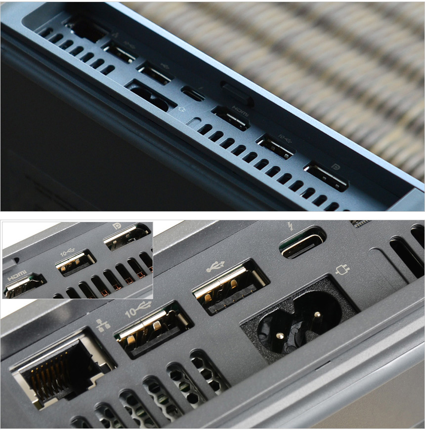 확장성이 떨어지는 일부 미니PC와 달리 다양한 단자를 지원해 주변기기를 편하게 연결할 수 있는점도 매력적인 부분이다. 전면과 후면에 USB 단자를 지원해 편하게 주변기기를 연결할 수 있으며 썬더볼트 4 단자를 지원해 빠른 데이터 전송은 물론 디스플레이 출력과 같은 고급기능 사용이 가능하다. 특히 최대 4개의 모니터 연결이 가능해 멀티테스킹이 필요한 환경에서도 불편없이 사용할 수 있다.