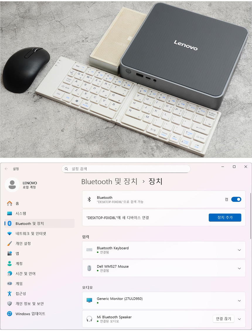 테스트를 위해 PC를 책상위에 설치한 모습으로 공간을 많이 차지하는 일반PC와 달리 모니터의 작은 공간에 손쉽게 설치할 수 있었다. (경쟁 모델들과 달리 스탠드를 기본 제공해 협소한 공간에 쉽게 설치할 수 있다.)