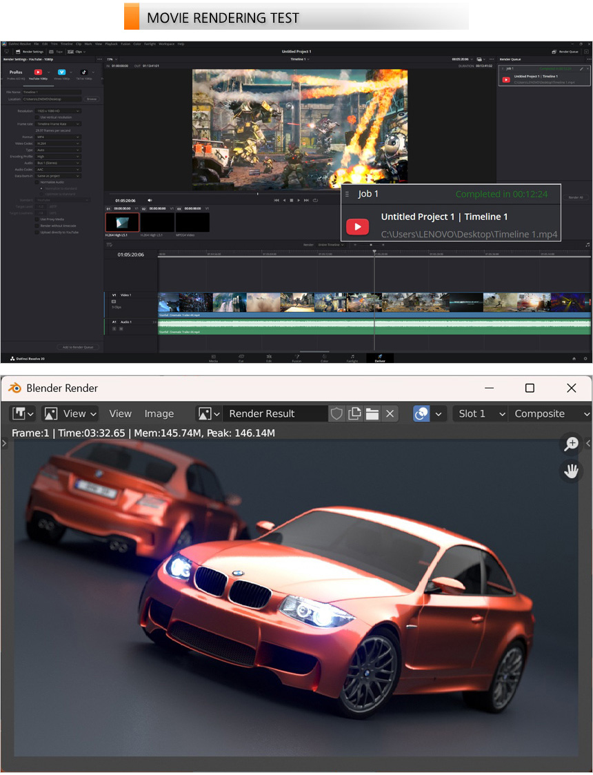영상편집 S/W 다빈치 리졸브를 이용해 랜더링 테스트를 진행하고 있는 모습으로 (640MB, 920MB, 990MB 4K 동영상을 단일 동영상으로 랜더링, FHD 해상도에 H.264 비디오 코덱) 12분 24초가 소요되는 것을 확인할 수 있었다. 또한 블랜더 랜더링 테스트에서도 4~5분대의 시간을 보여주는 일반 PC와 달리 3분대의 빠른 랜더링 시간을 보여주었다.