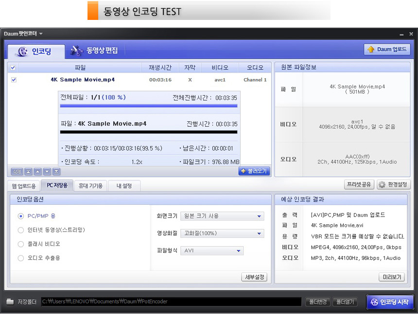 다음 팟인코더를 이용해 4K 동영상의 인코딩 테스트를 진행하고 있는 모습으로 3분 35초의 빠른 인코딩 시간을 보여주었다.