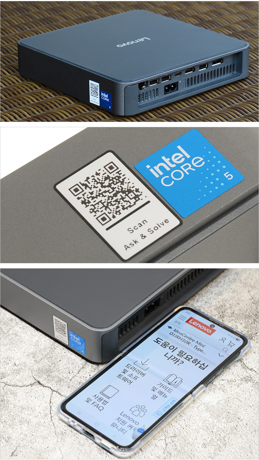 성능이 떨어지는 저가형 미니PC들과 달리 고성능 노트북 등에 적용되고 있는 인텔코어 5 210H 프로세서를 탑재해 활용성을 한층 높였다. 4+4코어 12스레드에 12MB 캐시 적용으로 고성능을 필요로 하는 S/W 도 부드럽게 실행할 수 있다. 또한 측면에 QR코드를 스마트폰으로 스캔하면 보증기간과 가이드 확인이 가능하며 드라이버를 다운로드 받을 수 있다.