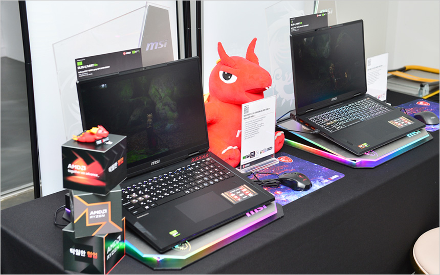 글로벌 게이밍 노트북 시장을 선도하고 있는 MSI 에서는 다양한 제품들을 전시했다. 엔비디아의 레이트레이싱을 확연하게 구분할 수 있도록 2대의 노트북을 통해 비교 테스트를 진행 했으며 최신 기술이 적용된 다양한 신제품을 직접 체험해 볼 수 있었다.