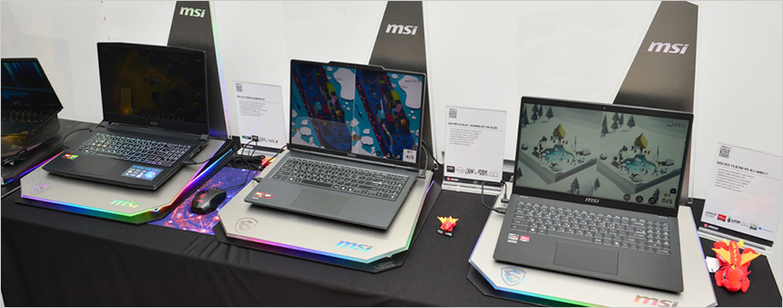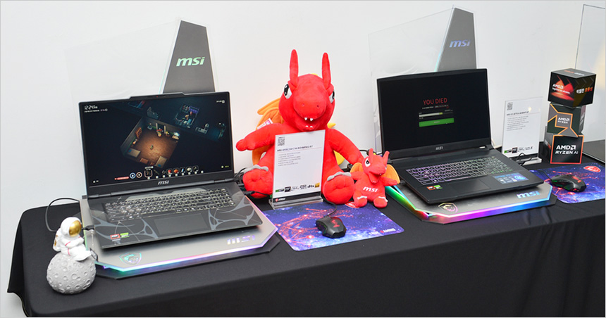 압도적인 가성비와 세련된 디자인으로 메인스트림 시장에서 큰 사랑을 받고 있는 사이보그 A17 AI B2HWFKG-R7을 비롯해 라이젠 7 8845HS와 RTX 4060 탑재로 최신 게임도 부드럽게 즐길 수 있는 소드 GF76 A AI B8VF-R7와 GF66 A AI B8VF-R7, AI기반의 강력한 성능과 높은 생산성을 자랑하는 비즈니스 노트북 시리즈 벤처 A16 AI+, 합리적인 가격으로 부담없이 구입해 업무나 학습등의 용도로 활용할 수 있는 모던 시리즈 등이 전시되었다.
