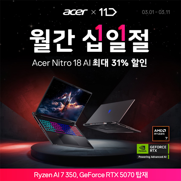 에이서는 3월 11일까지 진행되는 11번가 ‘월간 십일절’ 프로모션에 참여해 니트로 18 AI 게이밍 노트북을 최대 31% 할인된 가격에 선보인다고 밝혔다.