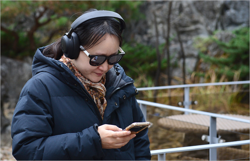착용감 테스트를 진행하고 있는 모습으로 컴팩트한 헤드폰이나 헤드셋과는 무게차가 느껴졌다. 하지만 디자인 부분에서 언급한 것과 같이 과도하게 무겁지는 않아 목에 부담을 주지 않았다. 유닛 자체의 길이 조절이 가능할 뿐만 아니라 지지대 내부의 고무밴드 길이 조절도 가능해 머리가 큰 필자도 편하게 길이를 조절해 사용할 수 있었으며 (최대 길이로 늘렸을 때 여유가 있었던 몇몇 모델들과 달리 딱 맞는 느낌이었다.) 헤어밴드가 쿠션 역할을 해 정수리 등의 통증은 발생하지 않았다.