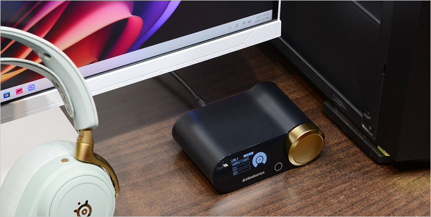 이 제품은 다양한 디바이스에서 사용할 수 있는 장점을 가지고 있다. PC에 연결해 사용할 경우 사진과 같이 게이밍 허브와 PC를 연결해 주면 게이밍 허브가 켜지게 되고 헤드셋의 전원을 켜주면 자동으로 연결된다. (게이밍 허브의 크기가 작아 자리를 많이 차지하지 않는다.) 게이밍 허브에는 대형 볼륨 다이얼이 설치되어 게임이나 음악을 즐길때 빠르게 볼륨을 조절할 수 있다.