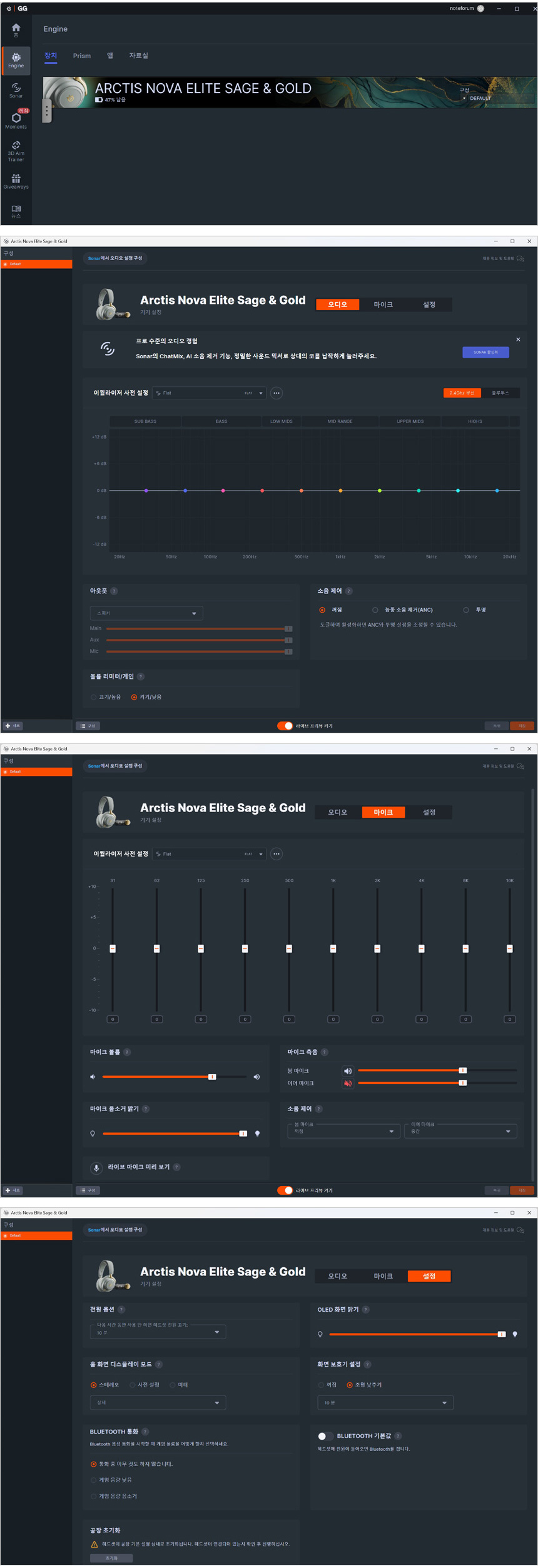PC나 노트북에서는 스틸시리즈 홈페이지에서 전용 S/W를 다운로드 받아 사용할 수 있다. 상단의 사진은 스틸시리즈 GG를 실행한 모습으로 엔진 메뉴에서 제품 선택을 선택하면 EQ와 소음제어 등을 설정할 수 있다. (오디오/마이크/설정에서 다양한 옵션을 제공한다.)
