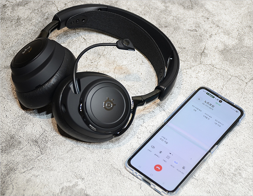 마이크 성능을 확인하기 위해 전화통화 테스트를 실행하고 있는 모습으로 기본적으로 상대방의 음성이 정확하게 들렸으며 딜레이 현상도 발생하지 않았다. 또한 자연스럽게 1분 이상 통화를 했는데 전혀 헤드셋 사용을 인지하지 못하는 것을 확인할 수 있었다. 이 제품은 마이크에도 소음제거 기술이 적용되어 있어 다소 시끄러운 환경에서도 정확하게 음성을 전달할 수 있다. (정확한 음성 전달이 필수적인 팀채팅에서 특히 만족하며 사용할 수 있을 것이다.)