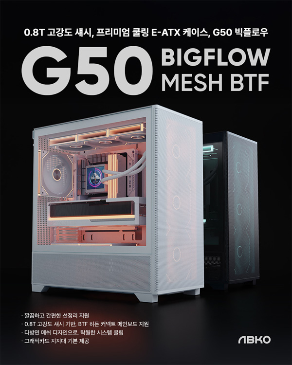 앱코에서 차세대 조립 트렌드에 맞춘 프리미엄 E-ATX PC 케이스 ‘G50 빅플로우 MESH ARGB BTF’를 공식 출시했다.