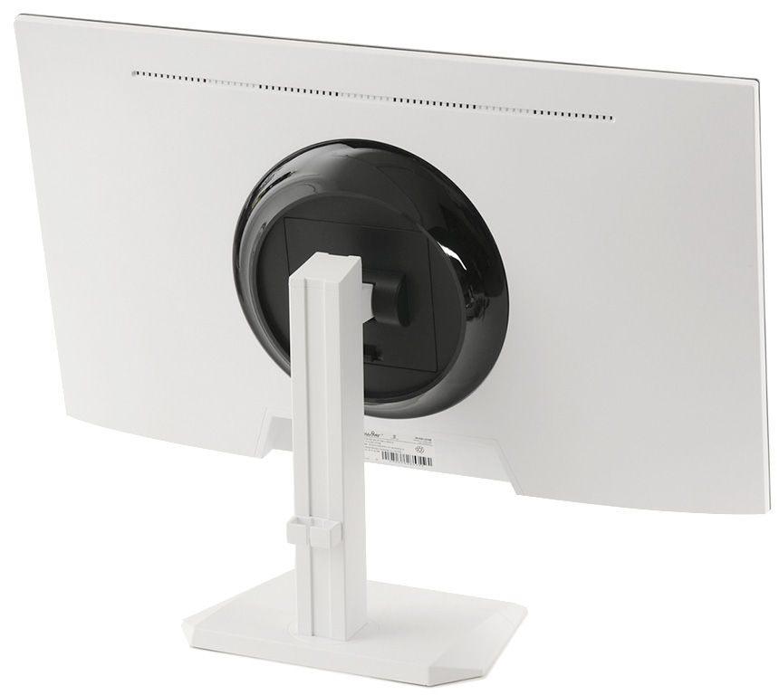 받침대는 툴리스 방식을 지원해 공구없이 손쉽게 탈착할 수 있으며 내부에는 100mm 베사홀이 설치되어 벽에 걸거나 ARM 등에 장착해 사용할 수 있다. (베사 연장볼트 지원으로 더 편하게 걸수 있다.) 하단 중앙에는 DP 1.4 단자와 HDMI 2.0 단자를 지원해 PC는 물론 게임콘솔이나 IPTV, OTT 플레이어 등을 손쉽게 연결할 수 있다.