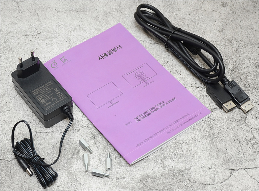 풀KIT 의 모습으로 케이블 일체형 전원 어댑터와 DP 케이블이 제공되며 사용설명서와 베사 연장볼트가 포함된 것을 확인할 수 있다.