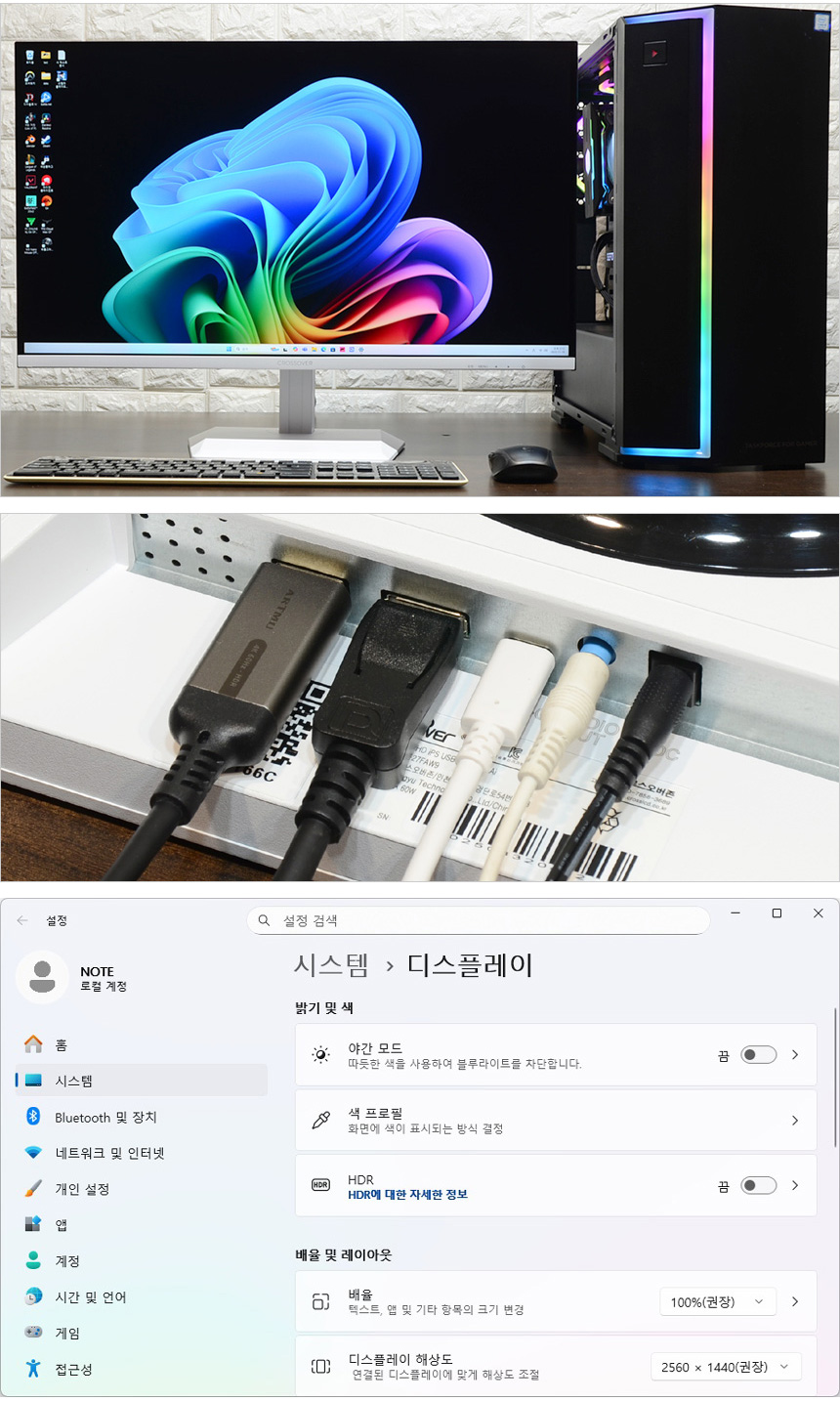 모니터와 PC를 셋팅한 모습으로 슬림 베젤이 적용된 모델답게 많은 공간을 차지하지 않았다. 대화면 모니터를 사용하기 힘든 집이나 사무실에서 유용하게 활용할 수 있을 것이다. 이 제품은 HDMI 와 DP 뿐만 아니라 C타입 단자도 지원해 호환성 걱정없이 디바이스와 연결할 수 있는 장점을 가지고 있다. (PC는 DP와 연결하고 HDMI 와 C타입에는 게임콘솔이나 IPTV, 스마트폰 등의 디바이스와 연결해 사용하는 것을 추천한다.)