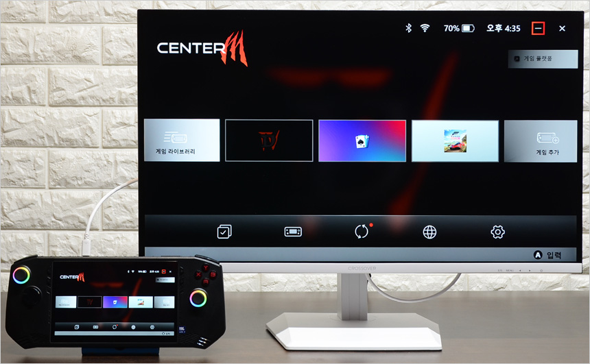 노트북과 HDMI로 연결한 모습으로 원활하게 작동하는 것을 확인할 수 있었다. 집이나 노트북사무실에서 대화면으로 노트북을 사용하고 싶을 경우 좋은 대안이 될 것이다. 또한 C타입 단자를 지원해 최근 많은 유저들이 사용하는 게이밍 UMPC와 연결해 대화면으로 게임을 즐길 수 있다. 상단의 사진은 게이밍 UMPC 연결 테스트를 진행하고 있는 모습으로 원활하게 동작하는 것을 확인할 수 있었다.