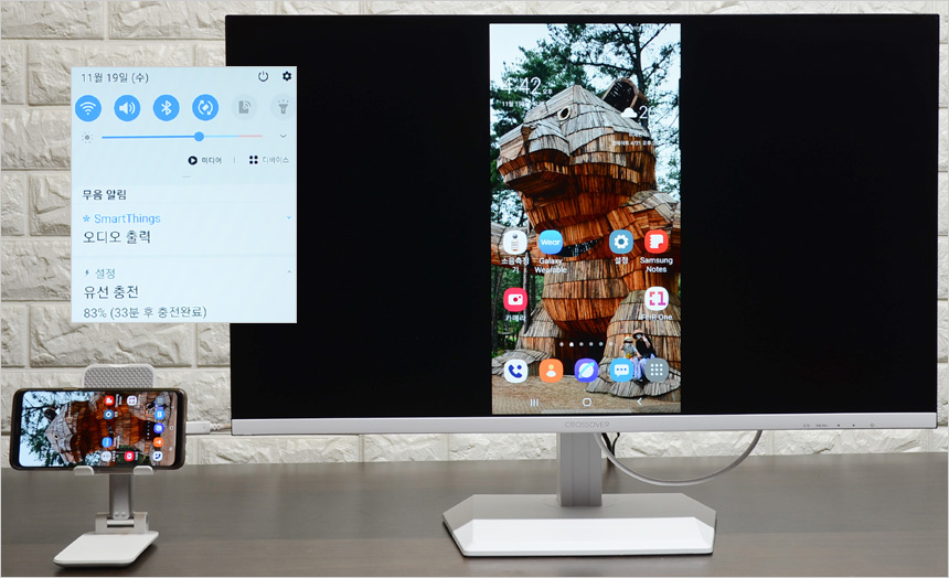 스마트폰 영상을 대화면으로 즐기고 싶을 경우 좋은 대안이 될 수 있다. 특히 삼성 DEX를 지원하는 스마트폰을 사용하고 있을 경우 스마트폰 연결만으로 PC처럼 활용할 수 있다. (키보드와 마우스는 스마트폰에 블루투스로 연결하면 된다.) 15W PD충전을 지원하는 모뎁답게 연결즉시 스마트폰이 충전되는 것도 확인할 수 있었다. @ 참고로 충전은 모든 스마트폰에서 가능하지만 화면 출력은 미러링을 지원하는 스마트폰에서만 가능하다.