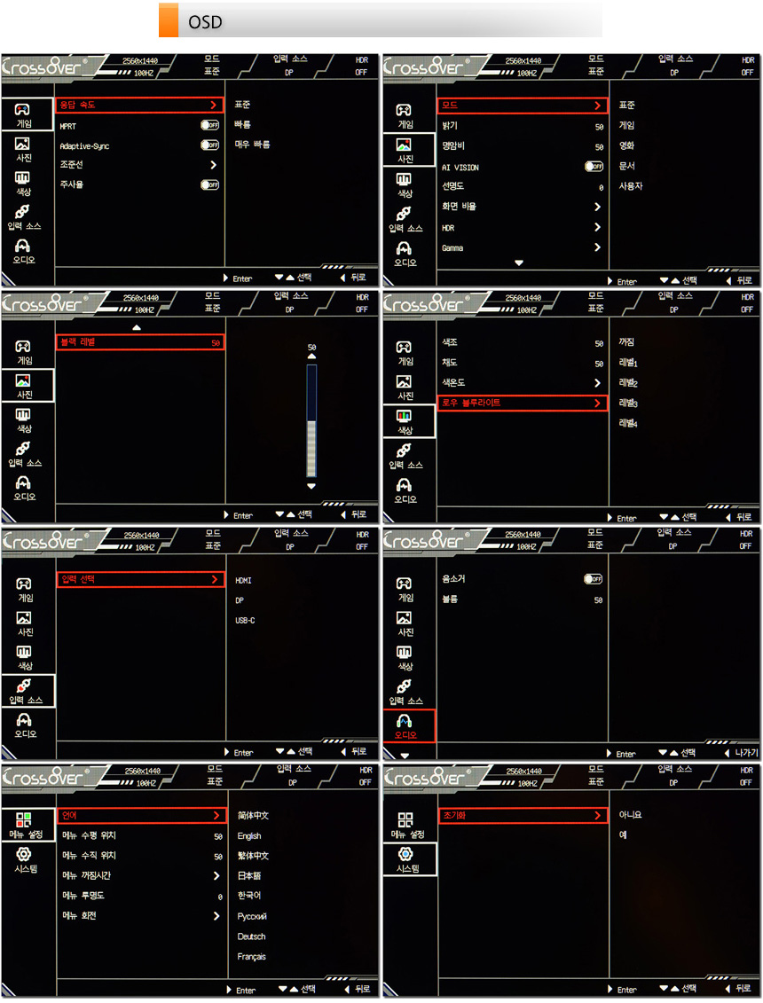 깔끔한 디자인의 OSD UI의 모습으로 게임전용 메뉴가 제공되며 명암과 밝기를 비롯해 다양한 설정을 제공해 사용자에 맞게 모니터를 셋팅할 수 있다. 참고로 핫키를 제공해 입력소스와 조준선, 볼륨 등을 빠르게 설정할 수 있다. (동영상을 참조하기 바란다.)
