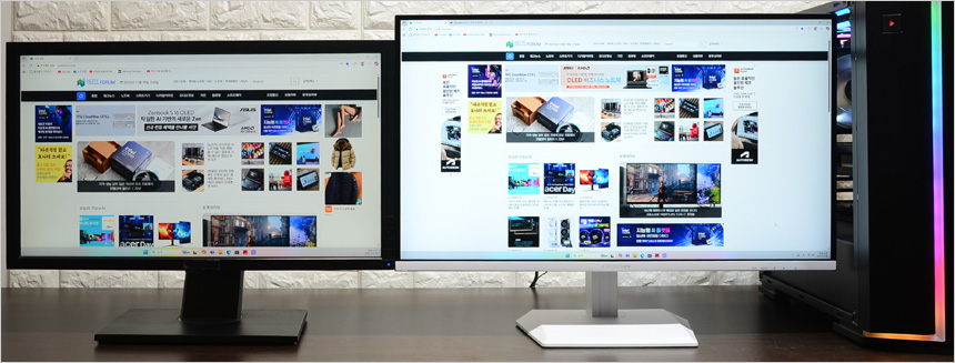 모니터를 셋팅한 김에 베젤 두께를 비교해 보았는데 사진과 같이 큰 차이가 발생하는 것을 확인할 수 있다. 날렵한 사이즈가 매력적이며 배젤 등으로 인한 답답함 없이 영상을 즐길 수 있을 것이다.