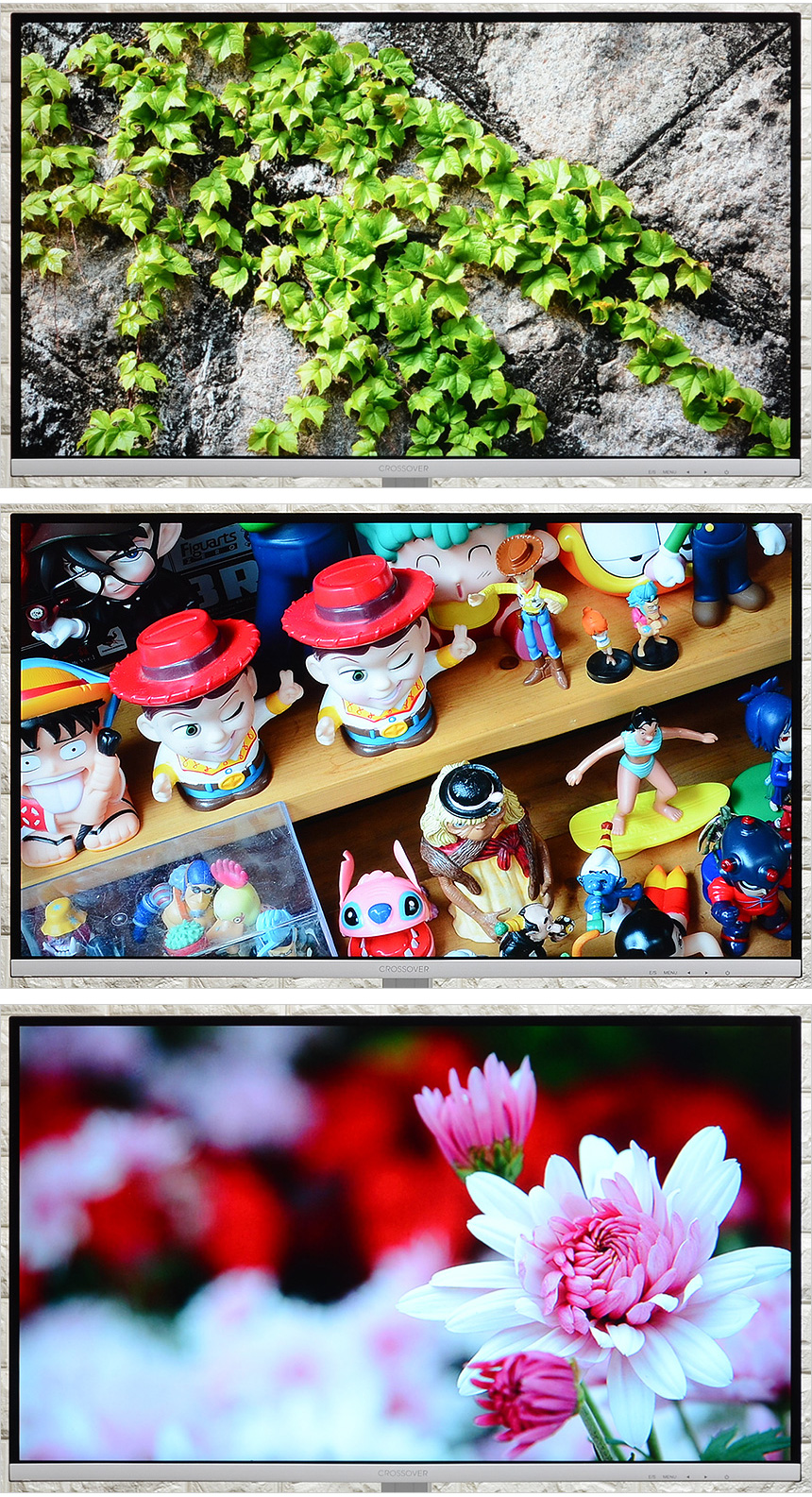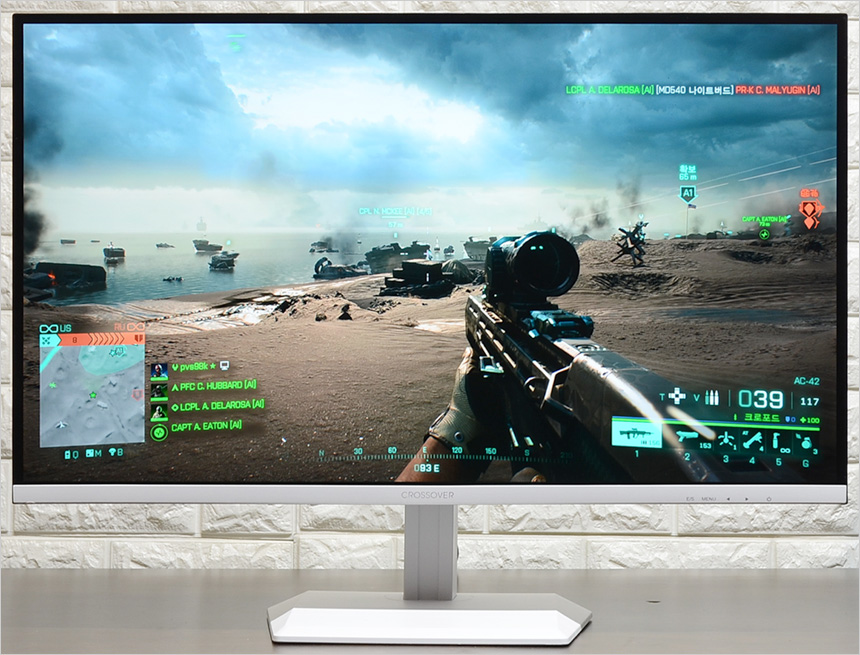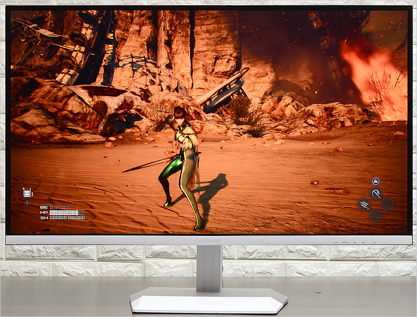 모니터 하단부의 모습으로 로고가 중앙에 세겨져 있으며 하단에는 OSD 버튼이 장착되어 모니터의 주요 기능을 손쉽게 조작할 수 있다. (리모콘을 기본 제공해 편의성을 높였다.) 이 제품은 게이밍 모니터 명가인 크로스오버 모델답게 다양한 게임관련 기술을 제공한다. 프리싱크와 지싱크 호환 기술을 지원해 영상이 잘리거나 찟어지는 등의 현상 (티어링) 없이 깔끔한 게임 플레이가 가능하며 사격 정확성을 높이는 Ai 조준선과 다양한 화면모드 지원으로 편하게 게임을 즐길 수 있다.