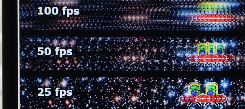 상단의 사진은 100Hz 의 높은 주사율을 쉽게 확인할 수 있도록 하위 프레임과 같이 재생되는 영상 (960 Pixel Per Sec) 을 셔터스피드 1/20 로 촬영한 모습으로 프레임이 낮을수록 캐릭터의 수가 적으며 프레임이 높아질수록 시간당 많은 화면이 뿌려지기 때문에 캐릭터의 수가 많은 것을 확인할 수 있다.