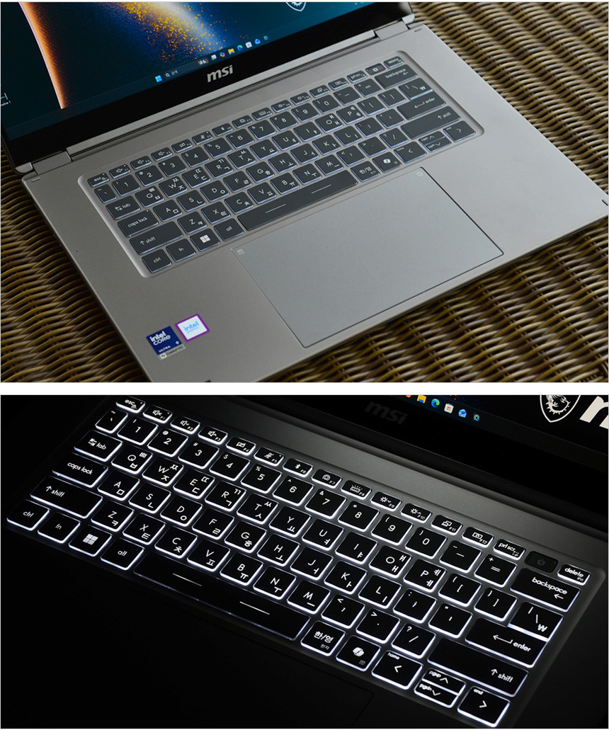 키보드의 모습으로 16형 대화면을 지원함에도 텐키리스 방식이 적용된 것을 확인할 수 있다. NUM 키패드가 없어 숫자입력이 많은 엑셀등을 사용할 때 약간의 불편이 있긴 하지만 정중앙에 키보드가 위치해 (텐키방식은 좌측으로 쏠린다.) 더 편하게 안정적인 타이핑이 가능하다. 또한 LED 백라이트가 설치되어 야간에도 불편없이 사용할 수 있다. (단축키를 통해 ON/OFF와 밝기 조절이 가능하다.)