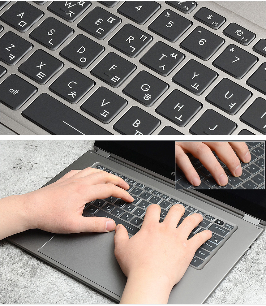타이핑 테스트를 진행하고 있는 모습으로 대화면 노트북 특유의 넓은 키간격으로 오타없이 고속 타이핑이 가능했으며 팜래스트가 손을 완전히 받쳐주어 손이나 손목등의 피로감이 크지 않았다. 키압은 낮은 편이며 긴 트래블과 높은 탄력으로 손가락의 부담없이 타이핑 할 수 있었다. 장시간 타이핑 작업으로 해야하는 직장인이나 대학생이 편하게 사용할 수 있을 것이다.
