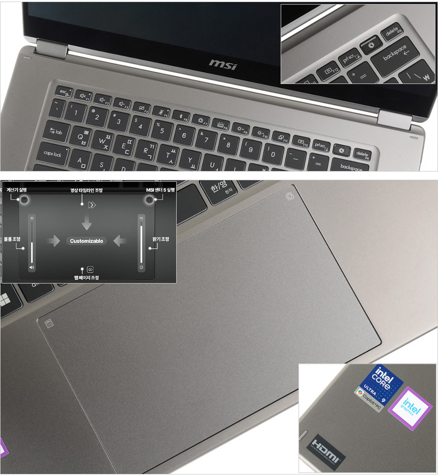 키보드 1열에는 밝기와 볼륨, 키보드 백라이트, 화면회전 등을 손쉽게 설정할 수 있는 다양한 핫키가 제공되며 전원 버튼에 지문인식 센서가 장착되어 보안성과 편의성을 높였다. (전원 버튼은 쉽게 눌리지 않도록 디자인 되었다.) 또한 팜래스트 중앙에는 멀티 터치패드가 장착되어 외부에서도 편하게 노트북을 조작할 수 있다. 특히 다양한 기능을 지원해 노트북을 더 편하게 사용할 수 있다. (자세한 사항은 동영상을 참조하기 바란다.)