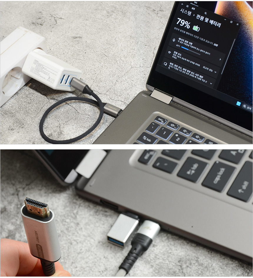 썬더볼트 4 단자는 빠른 데이터 전송이 가능하며 젠더를 사용해 A타입의 일반 주변기기도 연결할 수 있다. 또한 디스플레이 출력 지원으로 4K 모니터 연결이 가능하며 PD 충전도 가능해 전용 충전기 뿐만 아니라 시중에서 쉽게 구입할 수 있는 PD충전기를 이용해 전원을 공급할 수 있다.