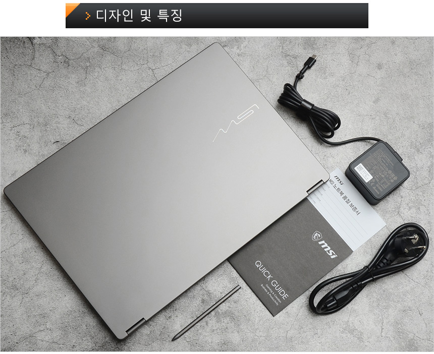 풀KIT 의 모습으로 노트북을 비롯해 65W 전원 어댑터와 전원 케이블이 제공되며 퀵 매뉴얼과 보증서를 제공한다. 또한 디스플레이가 360도 회전하는 투인원 노트북 답게 MSI 나노펜이 포함된 것을 확인할 수 있다.