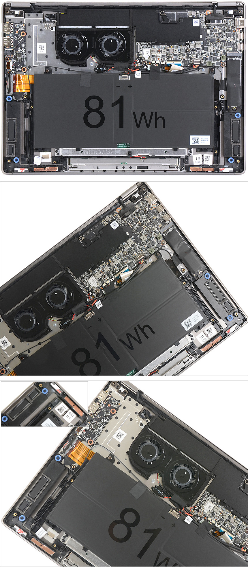 바닥면 내부의 모습으로 상단에는 CPU와 전원부의 열을 식혀주기 위해 듀얼팬이 장착되어 있으며 하단에는 81Wh 대용량 리튬이온 배터리를 비롯해 스피커와 마그네틱, 무선랜 안테나 등이 설치된 것을 확인할 수 있다. 32GB LPDDR5x 메모리가 온보드로 제공되며 1TB PCIe 4.0 NVMe SSD를 탑재해 빠른 속도를 경험할 수 있다. 또한 Wi-Fi 6 무선랜을 지원하는 구형 노트북들과 달리 킬러 Wi-Fi 7 무선랜카드가 설치되어 더 빠른 무선속도를 즐길 수 있다.