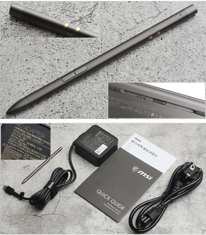 기본 제공되는 액세서리의 모습으로 MSI 나노펜을 기본 제공한다. 노트북 바닥면에 전용장착 공간이 제공되어 분실 가능성을 최소화 하며 충전 기능도 제공해 편의성을 높였다. 또한 C타입의 65W 전원 어댑터와 전원 케이블, 퀵 매뉴얼, 보증서 등을 지원한다.