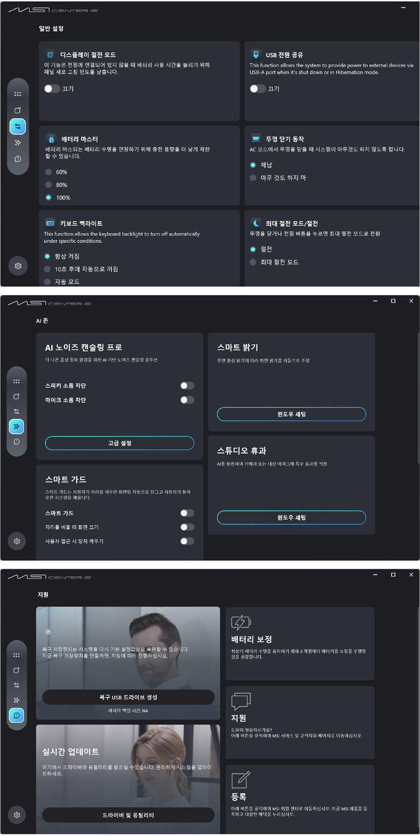 상시전원 설정등이 가능하며 AI 노이즈캔슬링 설정을 지원해 화상회의가 잦은 유저들이 편하게 노트북을 사용할 수 있다. 뿐만 아니라 인체감지 설정도 가능하고 복구 기능을 지원해 중요 자료를 안전하게 관리할 수 있다.