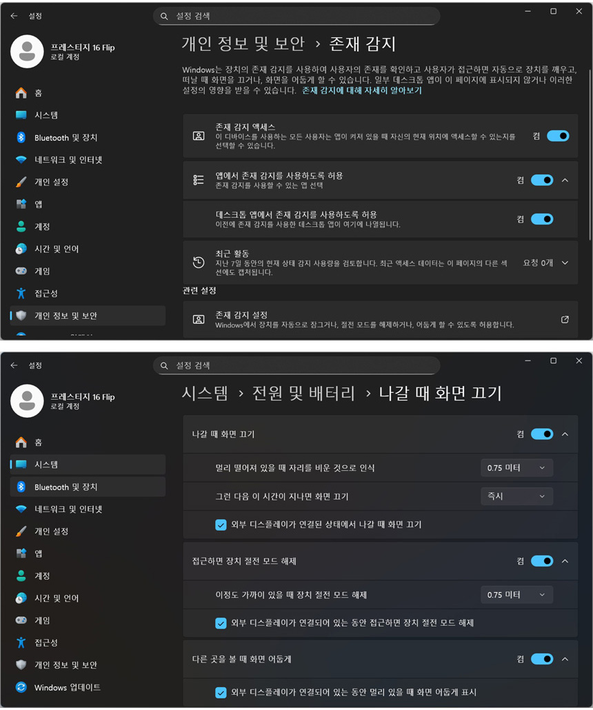 프리미엄 비즈니스 노트북 답게 인체감지 기술을 제공한다. 사용자가 자리를 비우면 화면이 자동으로 꺼지며 다시 자리로 오면 절전 모드가 해제되어 보안성과 편의성을 한층 높일 수 있다. @ 이 기능은 얼굴인식과 함께 사용하는 것을 적극 권장한다. 외부에서 자리를 비우면 자동으로 화면이 꺼지며 노트북이 잠금 상태가 되며 사용자가 자리에 앉으면 얼굴을 인식해 자동으로 켜지며 로그인 된다. 인체감지 설정은 설정->개인정보 및 보안->존재감지->존재감지 설정에서 셋팅할 수 있다. (동영상을 확인하기 바란다. 어떻게 동작하는지 쉽게 이해할 수 있을 것이다.)