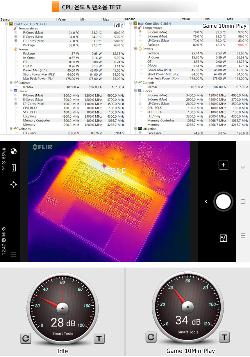 또한 열화상 카메라를 이용해 게임 실행중 노트북 표면의 열분포를 확인해 보았는데 칩셋이 설치된 중앙을 중심으로 열이 형성된 것을 확인할 수 있었다. 팜래스트 온도는 낮아 손을 올려두고 게임이나 작업을 했을 때 열로 인한 스트레스는 없었다.
