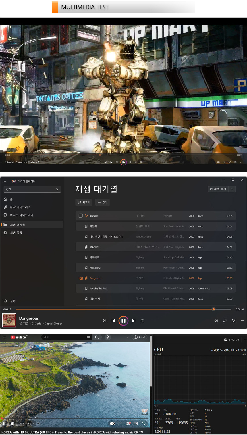 4K 동영상을 이용해 멀티미디어 테스트를 진행하고 있는 모습으로 16형 대화면에 2.8K 해상도의 OLED 패널을 탑재해 높은 디테일과 생생한 컬러를 즐길 수 있었다. 사운드 퀄리티도 상당히 뛰어난 제품으로 동영상 감상용으로 유용하게 사용할 수 있을 것이다. 또한 MP3 파일을 이용해 스피커 사운드 테스트를 진행하고 있는 모습으로 2개의 우퍼가 추가된 모델답게 중고음 위주의 일반 노트북과 확연히 다른 단단한 저음을 들려 주었다. 특히 게임에 특화된 노트북들과 달리 과한 느낌이 없어 음악감상시에도 상당히 만족스러웠다.